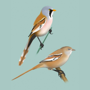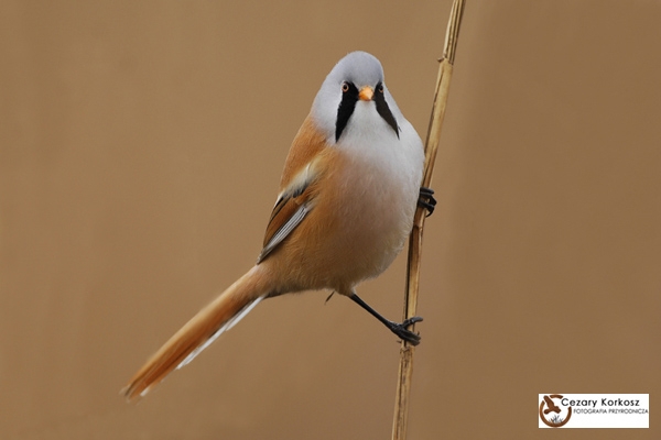 Ptak przypominający nieco sikorę, ale z długim, schodkowanym ogonem. Ubarwienie rudawobrązowe. Samiec ma popielatą głowę z długimi czarnymi plamami w kształcie wąsów oraz czarne podogonie. Na skrzydłach czarno-rudo-biały rysunek. Samica bardziej płowa, bez czarnego rysunku na głowie. Oko i dziób żółte.
