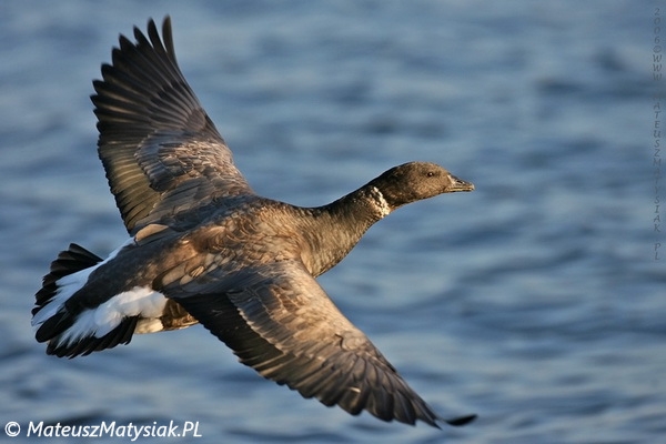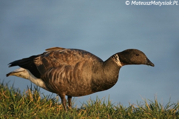 Niewielka gęś, tylko nieznacznie większa od krzyżówki. Głowa, szyja i góra piersi są czarne z wyjątkiem białych plam po bokach szyi. Wierzch szarobrunatny. Ubarwienie spodu ciała zależy od podgatunku. W kraju pojawia się głównie forma ciemnobrzucha B. b. bernicla, sporadycznie jest obserwowana forma jasnobrzucha B. b. hrota, zaś czarnobrzuchą formę B. b. nigricans odnotowano zaledwie dwa razy.