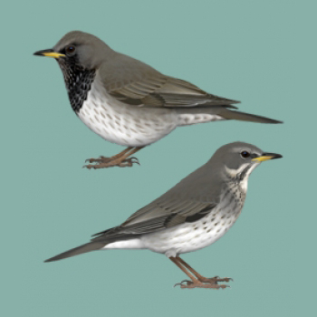 Drozd wielkości kosa. Samiec na rozległą plamę na gardle i szyi sięgającą aż do piersi, która u samicy jest jaśniejsza i złożona z czarnych plamek. Wierzch, skrzydła i ogon szare. Spód skrzydeł w locie rudawy. Dziób żółty z czarnym końcem.