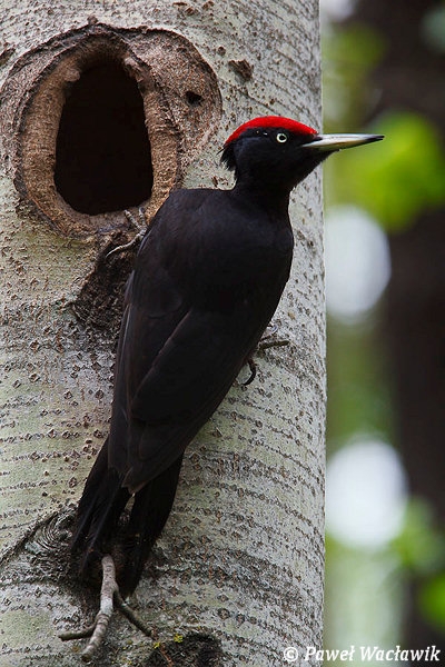 opis: Długość ciała: 45-50 cm. Największy z naszych dzięciołów, wielkością niewiele ustępujący gawronowi, z którym można go pomylić w locie, choć dzięcioł czarny jest smuklejszy i lata bardziej falistym lotem z nieregularnymi uderzeniami skrzydeł. Ubarwienie całe czarne. Samiec ma na głowie czerwoną czapeczkę, a samica tylko czerwoną plamę na potylicy. Dzięcioł czarny bębni bardzo głośno i donośnie wybierając do tego grube i suche konary. Wydaje też szereg innych głosów: metalicznych, wibrujących lub kwilących. Swym potężnym dziobem potrafi rozkuwać obumarłe pnie i wykuwać duże dziuple w zdrowym drzewie.