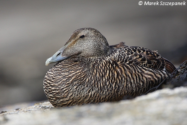 Często gniazduje kolonijnie na wybrzeżach morskich, gniazdo w płytkim zagłębieniu na otwartym terenie, pod okrywą z roślin lub wśród skał, wyścielone dużą ilością puchu