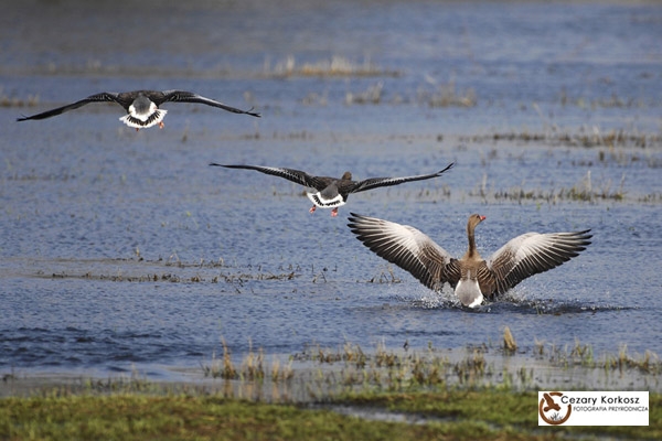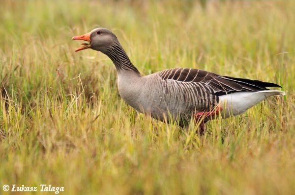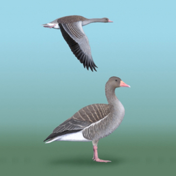 opis: Długość ciała: 75-90 cm. Duża gęś o szarobrunatnym ubarwieniu z różowymi nogami i dziobem. W locie ma jasnopopielate pokrywy skrzydeł, co odróżnia ją od przelotnej u nas gęsi zbożowej. Od niej wywodzą się gęsi domowe. Gęgawy tworzą pary na całe życie. Po lęgach odbywają pierzenie i wówczas wymieniają jednocześnie wszystkie lotki, tracąc zdolność do lotu .Więź rodzinna utrzymywana jest aż do wędrówki.