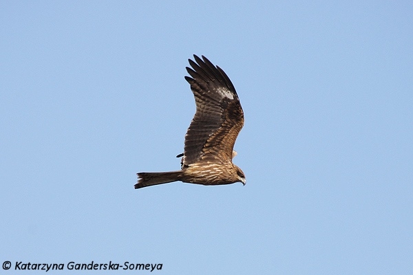 Wielkości myszołowa, ale o smuklejszej sylwetce z dłuższymi skrzydłami. Podobna do kani rudej, ale nieco mniejsza, ciemniejsza, z płytko wciętym ogonem. Ubarwienie brunatne z bardziej szarą, drobno kreskowaną głową i rozjaśnieniami na pokrywach naskrzydłowych, które w locie tworzą jasne pasy na wierzchu skrzydeł. Od spodu skrzydeł szare, słabo skontrastowane pola na częściach dłoniowych skrzydeł. Ogon brunatny, drobno prążkowany.