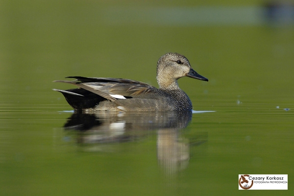 Kaczka nieco mniejsza i delikatniejsza od krzyżówki. Samiec w szacie godowej szary z jaśniejszą głową, ciemniej plamkowaną piersią oraz czarnym tyłem ciała i popielatymi sterówkami. Lusterko w skrzydle białe. Dziób czarniawy. Samica podobna do krzyżówki, od której różni się pomarańczowymi pasami po bokach dzioba i białym lusterkiem.