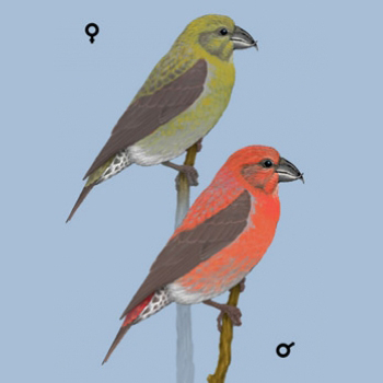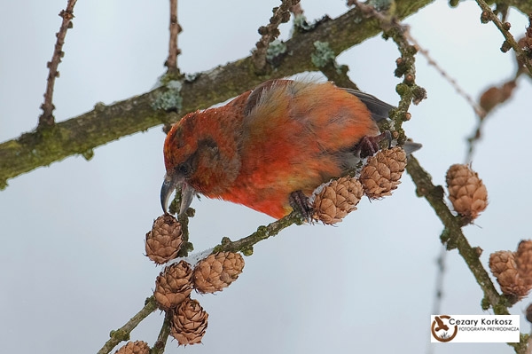 opis: Charakterystyka: 16?18 cm. Ptak wielkości wróbla o masywnej sylwetce z duża głową i mocnym dziobem oraz krótkim ogonem. Ubarwienie dorosłego samca karminowoczerwone z wyjątkiem brązowych skrzydeł i ogona. Samica jest oliwkowobrązowa. Krzyżodziób świerkowy ma niezwykłe zwyczaje. Żywi się nasionami wydobywanymi z szyszek za pomocą dzioba o skrzyżowanych szczękach, którymi podważa szyszkowe łuski. Pora gniazdowania uzależniona jest od urodzaju szyszek i może on przystępować do lęgów nawet zimą. W latach nieurodzaju podejmuje koczownicze migracje przemieszczając się stadnie na znaczne odległości.