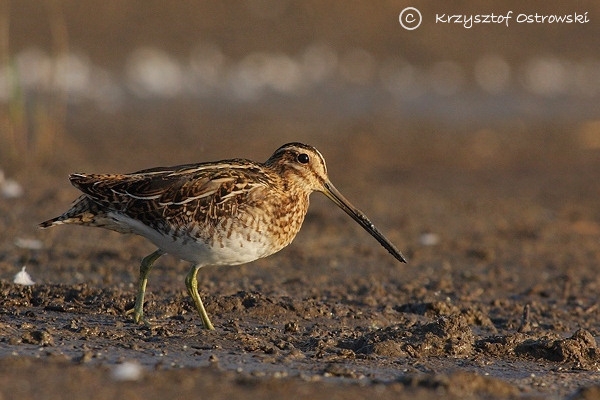 Ptak wielkości kosa. Ubarwienie maskujące, czarno-brązowo-szare ze skomplikowanym wzorem na poszczególnych piórach wierzchu ciała, który układa się w podłużne pasy. Na głowie rysunek złożony z równoległych brunatnych i płowych pasków. Pierś brunatno kreskowana, a brzuch po bokach prążkowany. Dziób długi, prosty, szary u nasady i czarny w części końcowej. Nogi dość krótkie, zielonkawoszare.