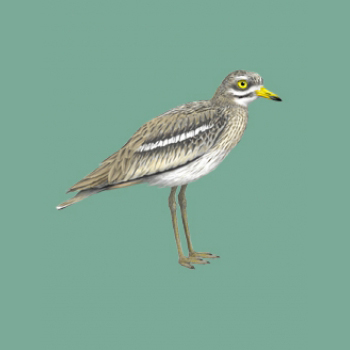 Ptak wielkości dużego gołębia. Sylwetka smukła na wysokich, żółtawych nogach. Głowa stosunkowo duża z żółtymi oczami. Brak zróżnicowania płciowego. Upierzenie płowoszare, brunatno kreskowane, z jasnymi i ciemnymi pasami na głowie i białym gardłem. Na skrzydłach białe, czarno obramowane pasy oraz plamy dobrze widoczne u ptaka w locie.