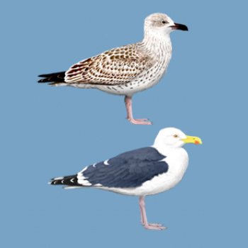 1. Największa nasza mewa, biało ubarwiona, z czarnym płaszczem. Potężny żółty dziób z czerwoną plamką przed końcem. Młode z brunatnym łuskowaniem, plamkowaniem i kreskowaniem.