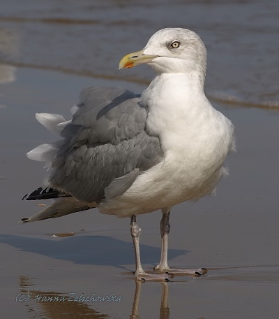 opis: Długość ciała: 54-64 cm. Duża biała mewa o popielatym wierzchu ciała. Końce lotek pierwszorzędowych czarne z białymi perełkami. Dziób mocny, żółty z czerwoną plamką przy końcu. Nogi różowe. Młode ptaki są brunatno plamkowane i w kolejnych czterech latach życia stopniowo uzyskują coraz jaśniejsze ubarwienie. Mewa srebrzysta zaczęła się gnieździć w Polsce w końcu lat 60. i stopniowo skolonizowała północne rejony kraju. Obecnie gniazduje kolonijnie na dachach budynków i innych obiektach portowych w wielu miastach naszego wybrzeża.
