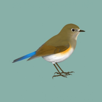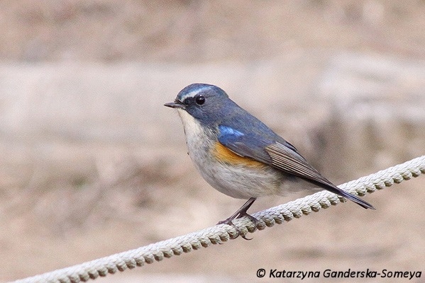Wielkości rudzika. Samiec w szacie godowej ma ciemnoniebieski wierzch ciała włącznie z ogonem, gardło białe a boki pomarańczowe. Samica i młody oliwkowobrunatne z wierzchu, pierś szara, gardło białe, a boki pomarańczowe. We wszystkich szatach ogon szaroniebieski.