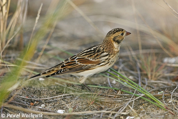 Mniejsza od trznadla z krótszym ogonem i dłuższymi skrzydłami. Samiec w szacie godowej wyróżnia się czarna głową i szyją z żółtawą brwią za okiem schodzącą w dół po boku szyi. Kark rdzawobrązowy, wierzch czarno plamkowany, spód biały. Dziób żółty z czarnym końcem. W innych szatach zaznaczony rudobrązowy kark a głowa brązowawa z szeroką brwią, zaś duże pokrywy skrzydłowe rdzawe i ograniczone dwoma paskami.