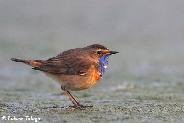 Ozdobą samca w szacie godowej jest niebieski śliniak podkreślony czarną i rdzawą półobrożą na piersi. Ubarwienie wierzchu ciała szarobrązowe, spodu jasnopłowe. Na głowie biała brewka. Ogon brunatny u nasady rdzawy z wyjątkiem środkowej pary sterówek. U samicy rysunek na gardle i piersi wyblakły ze zredukowaną ilością barwy niebieskiej.