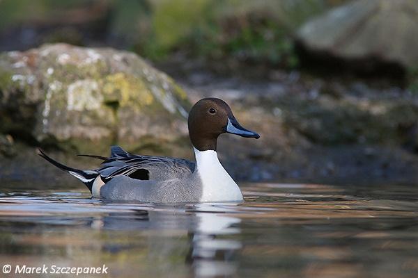 Prawie wielkości krzyżówki, ale znacznie smuklejszy z długim zaostrzonym ogonem u samca. Samiec w szacie godowej ma czekoladową głowę i szyję z białym klinem sięgającym po bokach szyi na tył głowy. Przód szyi i pierś białe, boki popielate, tył ciała kremowy i czarny. Na wierzchu czarne i popielate wydłużone pióra. Lusterko połyskujące zielono. Samica skromnie ubarwiona, brunatnobeżowa z łuskowanym rysunkiem na piórach. Dziób u obu płci smukły, stalowoszary.