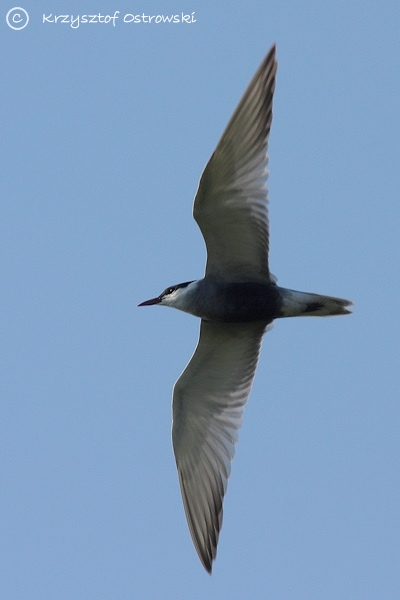 Nieco większa od rybitwy czarnej. Ubarwienie szare z jaśniej popielatymi skrzydłami. Czarna czapeczka kontrastuje z białymi policzkami. Dziób i nogi ciemnoczerwone.