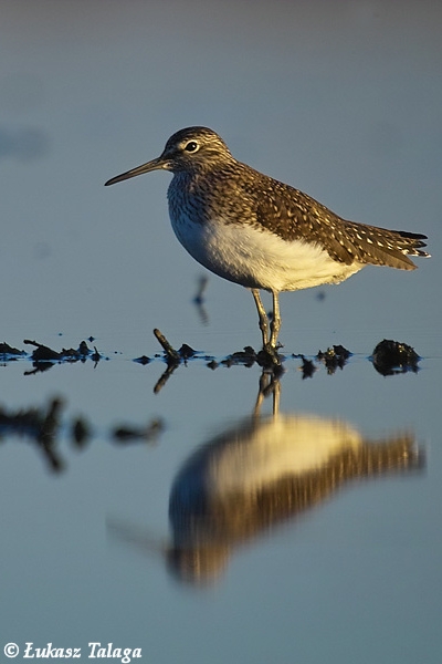 Ptak wielkości drozda, o smukłej sylwetce z długimi nogami i średnio długim dziobem. Wierzch ciała brunatny z białymi kropkami. Głowa, szyja i pierś drobno kreskowane. Spód ciała i kuper białe, ogon z 3 czarnymi paskami. W locie spód skrzydeł ciemny.