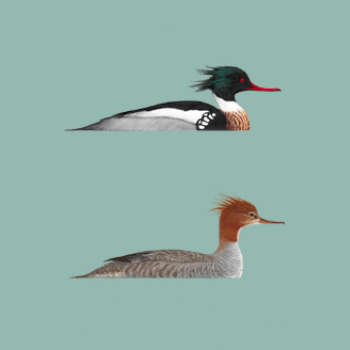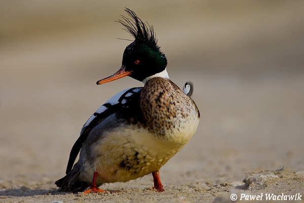 Wielkości krzyżówki, mniejszy i smuklejszy od nurogęsi. Samiec w szacie godowej łatwy do rozpoznania po czarnej, zielono połyskującej głowie z rozczapierzonym czubem, rdzawobrązowej, czarno plamkowanej piersi, popielatych bokach i czarno-białym wierzchu ciała. Samica płowoszara z brązową głową z krótszym czubem i białawą przodem szyi. Dziób smukły, brązowy z wierzchu, czerwony od spodu.
