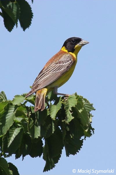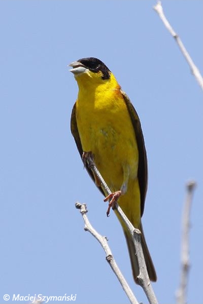 Większy i masywniejszy od trznadla zwyczajnego. U samca w szacie godowej głowa czarna z żółtym gardłem i bokami szyi. Wierzch brązowy, spód żółty. Pióra na skrzydłach z jasnymi obwódkami, ogon jednolicie brunatny. Samica szarobrunatna z szarym kapturem.