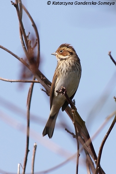 Najmniejszy z naszych trznadli, wyraźnie mniejszy od trznadla zwyczajnego o delikatnej sylwetce. Pasek ciemieniowy, brwi i gardło rdzawe, podobnie jak czarno obwiedzione policzki. Wierzch brązowy z ciemnymi smugami, spód biały z czarnym kreskowaniem po bokach. Dziób drobny i ostry. Samica podobna z mniej skontrastowanym rysunkiem.