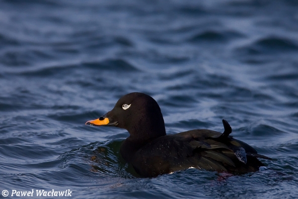 Duża kaczka morska wielkością zbliżona do krzyżówki. Samiec cały czarny z wyjątkiem białego lusterka na lotkach drugiego rzędu. Pod okiem biała plamka w kształcie przecinka. Dziób czarny z pomarańczowymi bokami. Samica brunatna z jasnym plamami po bokach głowy i całym ciemnym dziobem.