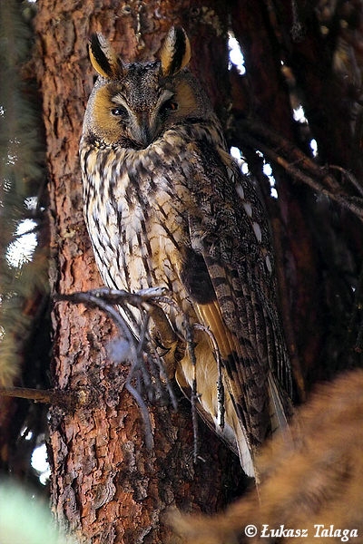 opis: Długość ciała: 33-39 cm. Nieco mniejsza od puszczyka, od którego różni się smuklejszą sylwetką, a przede wszystkim długimi uszami z pęków piór. Ubarwienie brunatnoszare, plamkowane brunatno i beżowo z wierzchu i kreskowane od spodu. Oczy pomarańczowe, a szlara rdzawa. W locie widoczne rdzawe plamy przy końcach skrzydeł. Uszatka jest aktywna w nocy, ale poluje głównie o zmroku i świcie. Najłatwiej zobaczyć ją zimą, gdy czasem zimuje gromadnie w grupach do kilkudziesięciu osobników skupionych na jednym lub kilku drzewach.