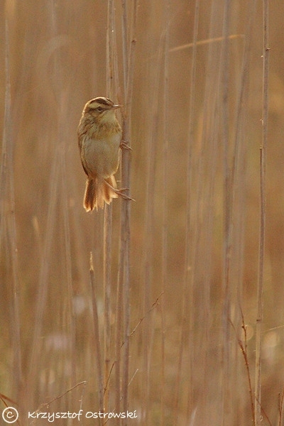 Smukły ptak o wyglądzie zbliżonym do rokitniczki. Ogólnie ubarwienie w odcieniu beżowobrązowawym. Głowa skontrastowana: czarna czapeczka przecięta przez środek płowym paskiem, szerokie, białawe brwi, podkreślone czarnym paskiem ocznym. Na wierzchu ciała po dwa równoległe żółtawe i czarniawe paski. Spód ciała płowy z delikatnymi kreskami po bokach.